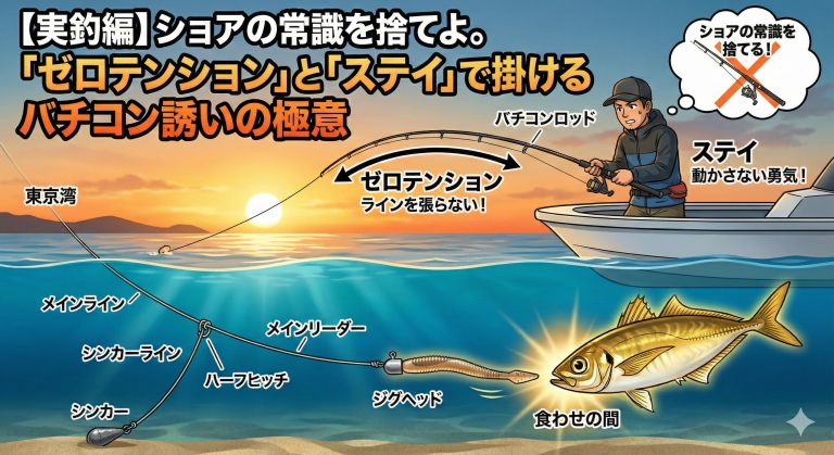 バチコンアジングにおいて、釣果の9割を決めるのは「動」のテクニックではありません。 いかにして「静(ステイ)」を作り出し、違和感を消せるか。 今回は、ショアの常識を捨て、東京湾のギガアジを狂わせる「ゼロテンション」の深淵なる世界へご案内します。