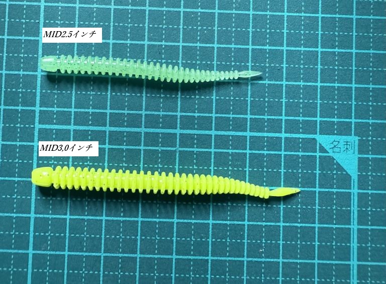 UVライトを使用したテストでケイムラカラーのワームとグローカラーのワームの発光色が把握できました。