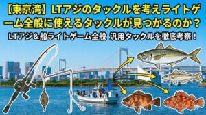 東京湾バチコンアジングでは、LTアジ乗合船に同乗させてもらう場合は、事前に船宿に問い合わせすることが重要。ラインはPE0.4号、オモリは10号(37.5g)~20号(75g)、ジグヘッドは0.3g、ワームは2インチ~3インチ、カラーはケイムラやグロー系、ハリサイズは#8~#6で太軸が好まれる